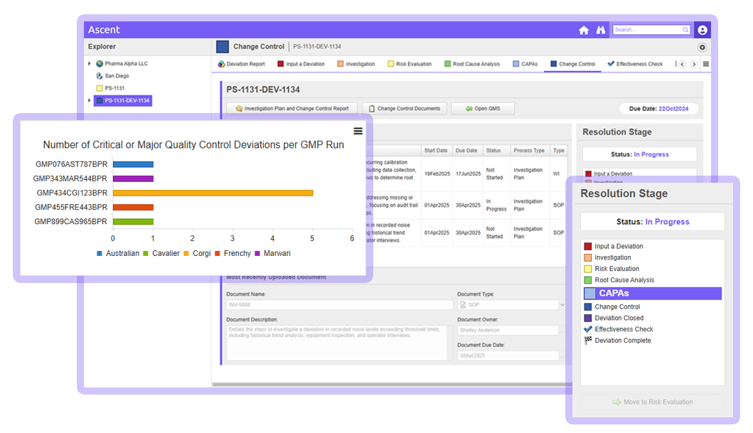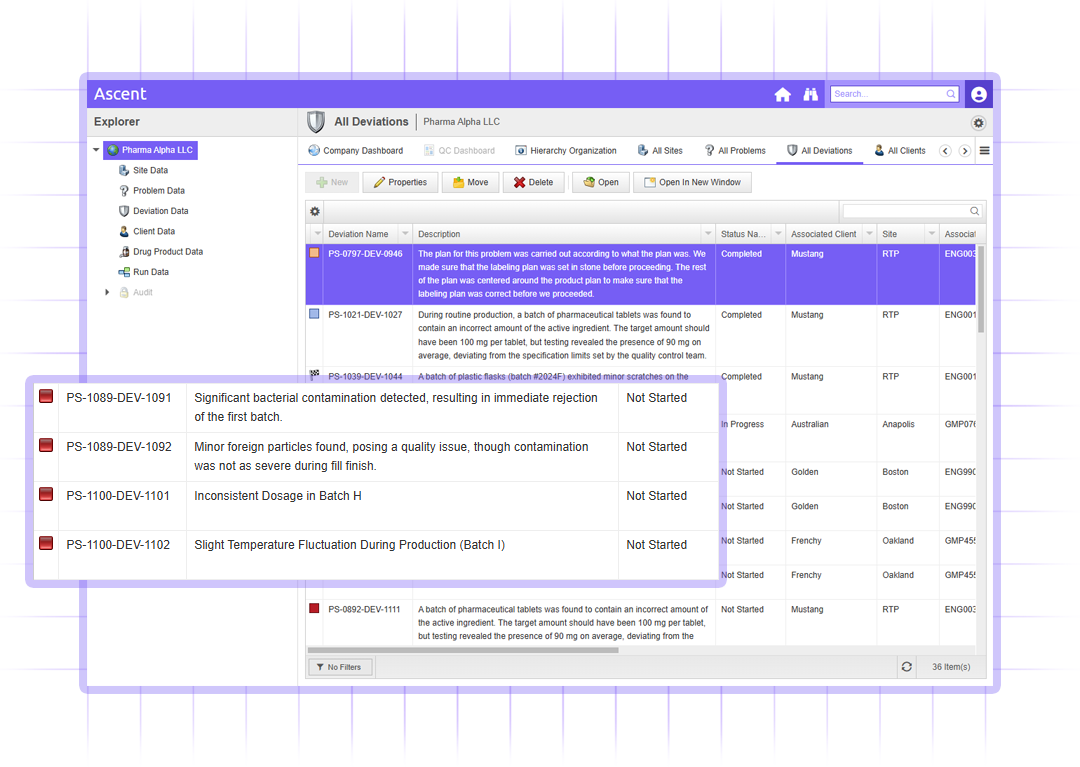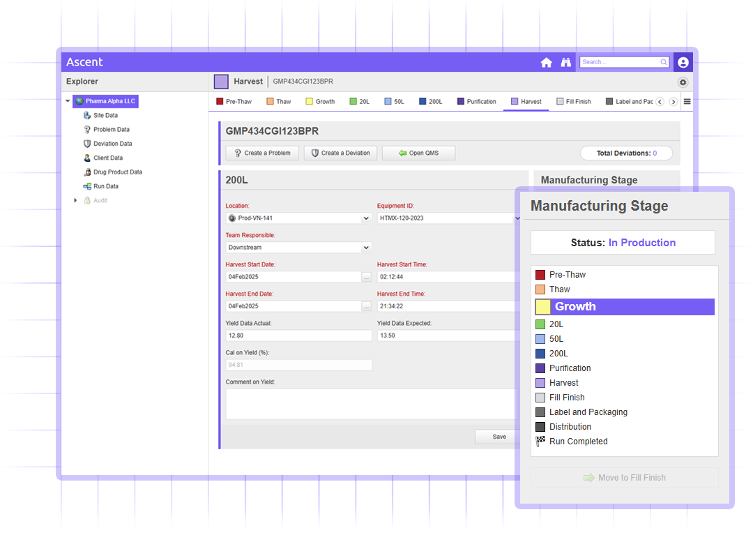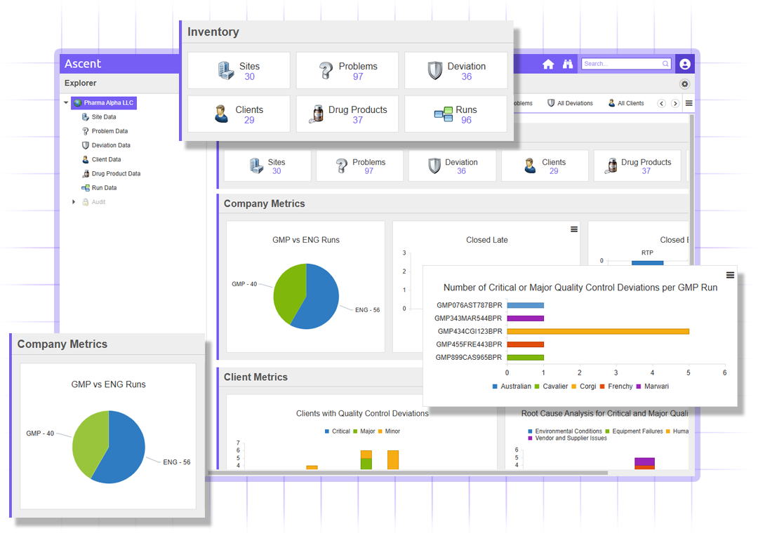 Ascent provides a holistic view of drug manufacturing for technicians and leaders, enabling streamlined communication and reporting, confident deviation resolution, rapid risk mitigation, and increased client satisfaction.